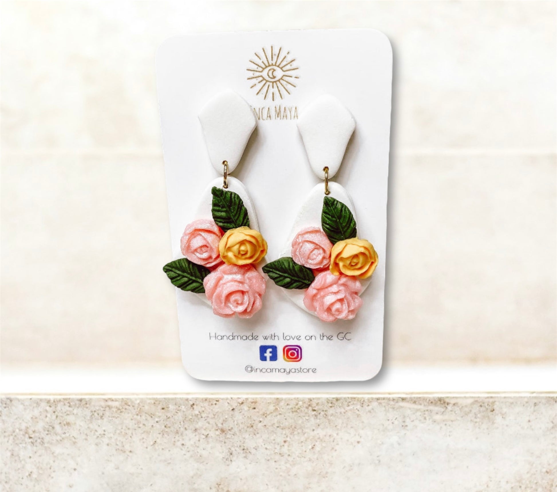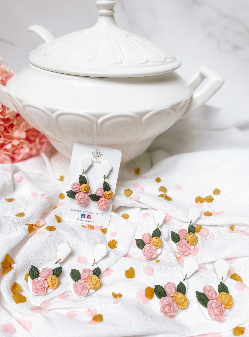 Materials: Polymer Clay, double baked, hand sanded, hand buffed, handmade roses & foliage & Hypoallergenic Plated Iron Earring Posts.