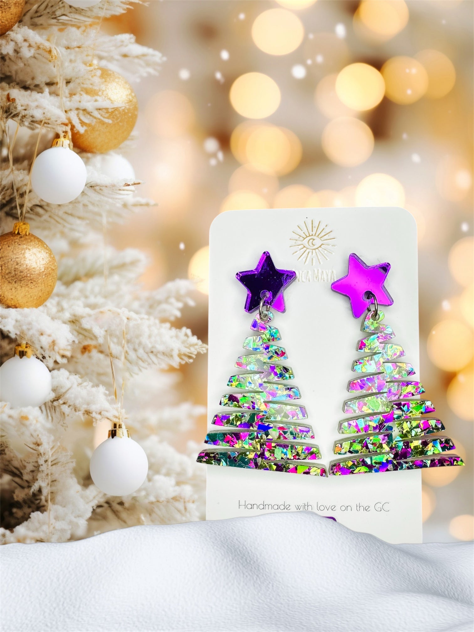 Materials: Chunky Glitter Acrylic Christmas Tree & mirrored star findings, finished with Surgical Stainless Steel (304) Earring Posts & Surgical Stainless Steel (304) Bullet Backs.