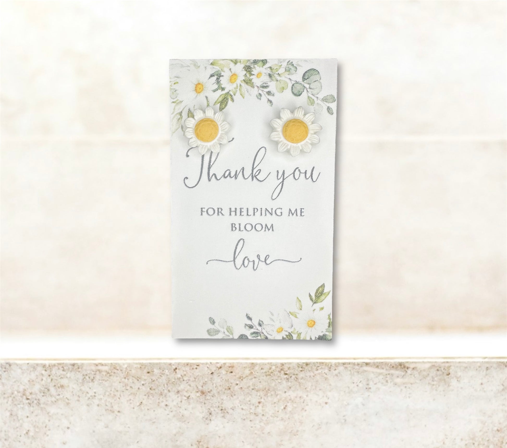 Handmade Daisy stud earrings on a “Thank you for helping me bloom” card with space to write name under the heart.🌼