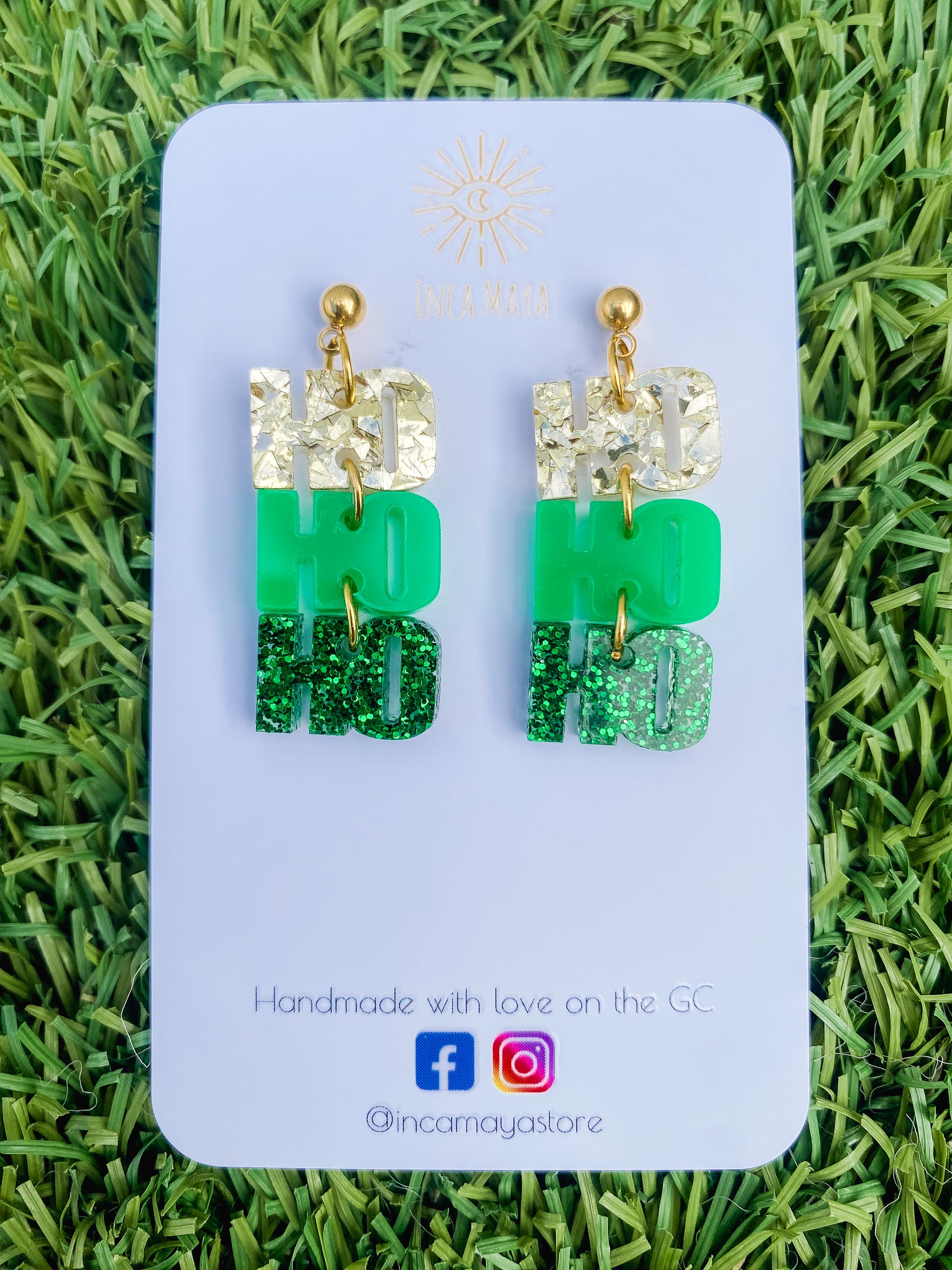 Materials: Glitter Acrylic hohoho wording, finished with Surgical Stainless Steel (304) Ball Stud Earring Posts & Surgical Stainless Steel (304) Backs.