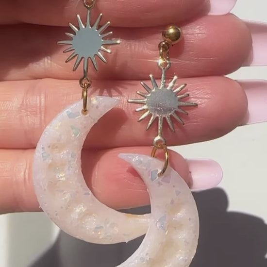 Materials: Transpucent Glitter Polymer Clay, Clear gloss varnish, brass sun charms, & gold Surgical Stainless Steel earring posts with Surgical Stainless Steel butterfly backs.