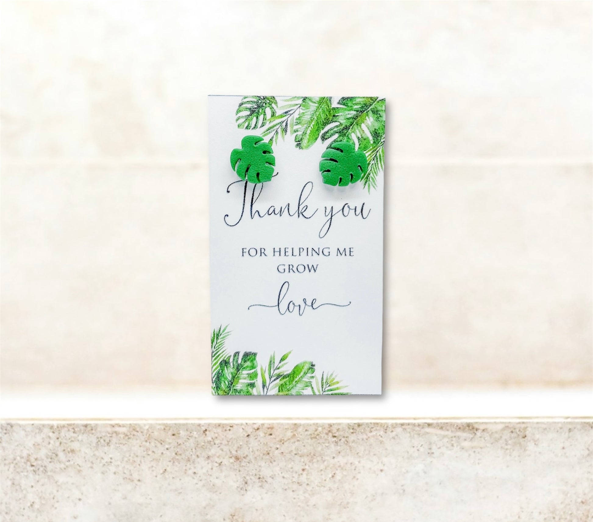 Handmade Monstera stud earrings on a “Thank you for helping me ggrow” card with space to write name under the ~Love~.🌿