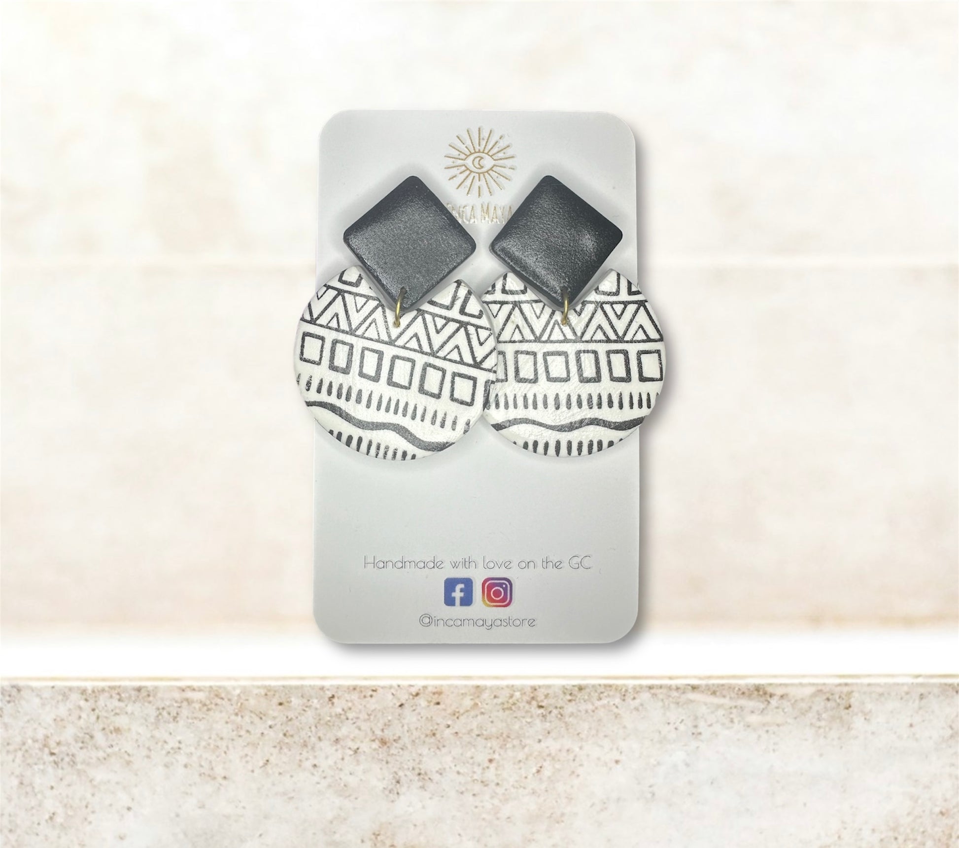 Materials: Black & white Polymer Clay using a silk screen painted technique, double baked, hand sanded, hand buffed, double varnished & Surgical Steel Earring Posts.