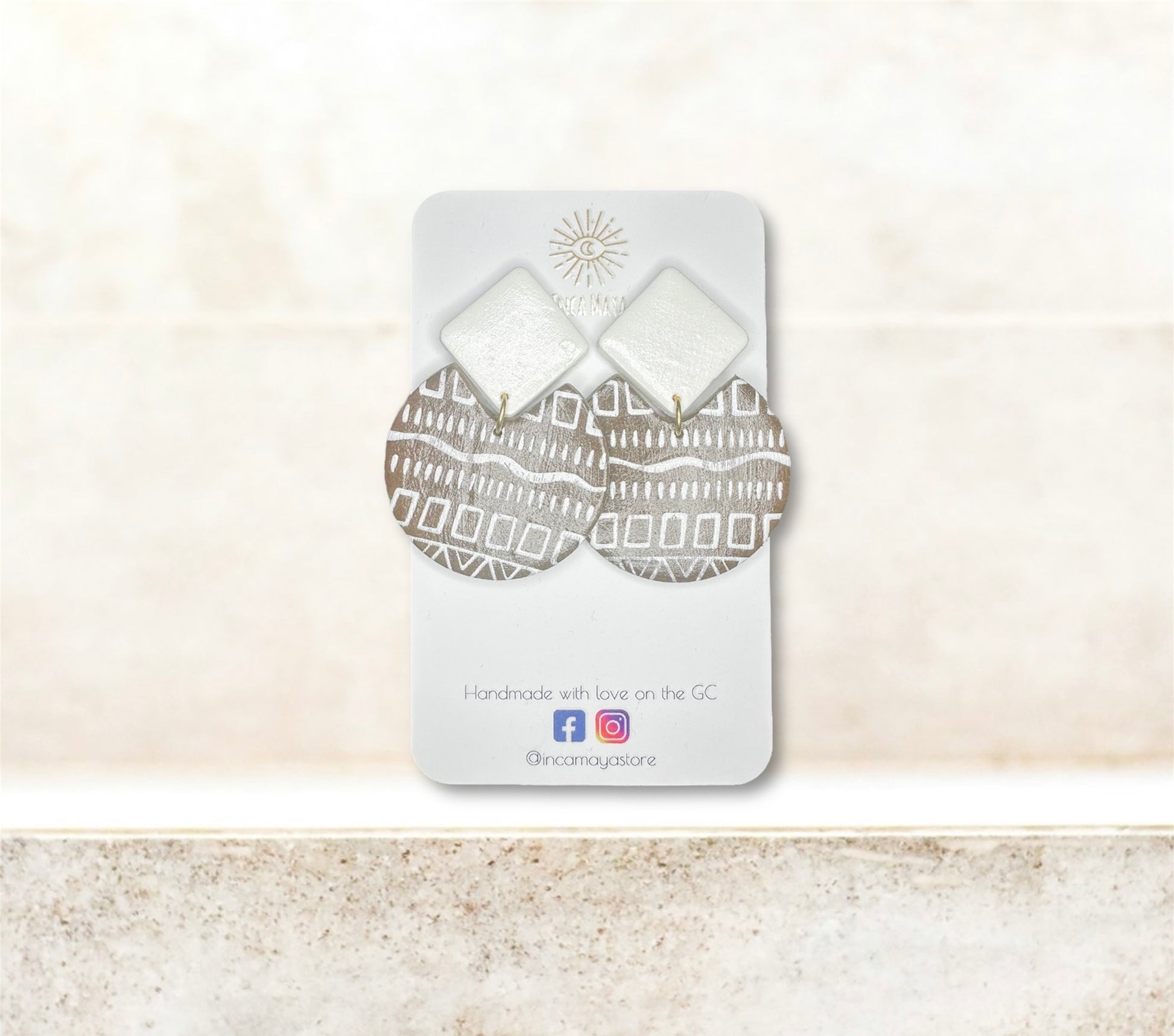 Materials: Chocolate & white Polymer Clay using a silk screen painted technique, double baked, hand sanded, hand buffed, double varnished & Surgical Steel Earring Posts.